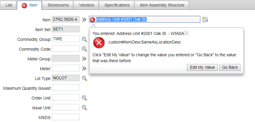 After deploying the code and associating the LocationSet to the Location object and the FldDescription class the Description field of the Item object, to test if the code works, open an Item and enter a description that matches the description of a location, it should throw an error message as in the image below: