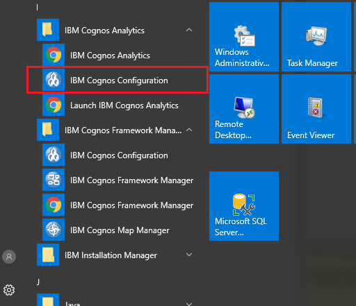 - Open “IBM Cognos Analytics” > “IBM Cognos Configuration” (not the one with the same name under “Framework Manager”)