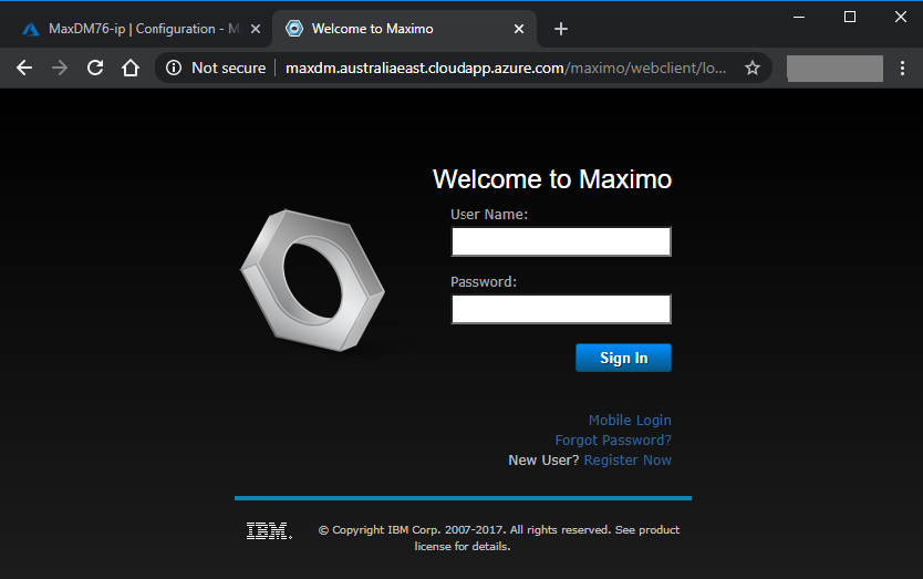5.1 Now I got Maximo running on the VM, I wanted to access it from the Web, so I went to the VM’s Networking page, and opened port 80 inbound for the VM, but it still didn’t work. After a bit of fussing around, I remembered I had to open the port on the VM’s Windows Firewall as well. After opened port 80 on both two firewalls, it worked like a charm, I could access Maximo from my laptop using the VM’s public IP