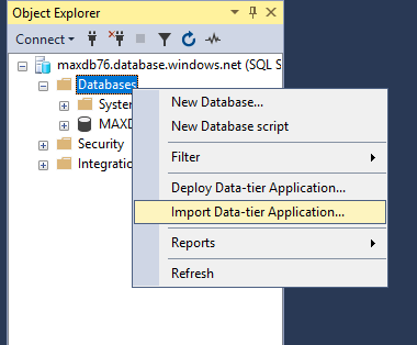 3.2 The whole export/import of bacpac file was straight-forward with a minimum number of clicks, and no confusion. After it’s done, I realized the import process restored the DB from my VM, and I ended up with two DBs, so I had to delete the empty one I created in the earlier step.