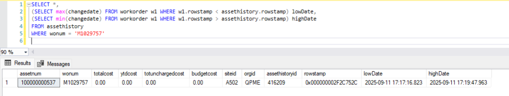 I needed to identify the root cause of this issue in this case, and wanted to know when the records were inserted and by whom. To do this, I use the following query which compares the rowstamp of the ASSETHISTORY table with the WORKORDER table.