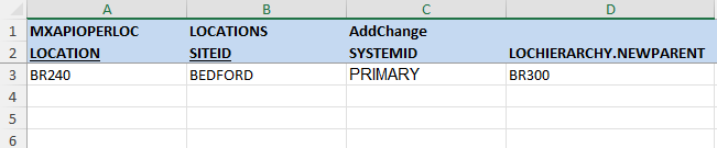 The LOCHIERARCHY object has a NEWPARENT non-persistent attribute which allows us to move a location to a new parent. Out-of-the-box, the MXAPIOPERLOC object structure has this field included by default. Thus, we can use MXLOADER to move a location to a new parent using a simple structure as shown in the example template below: