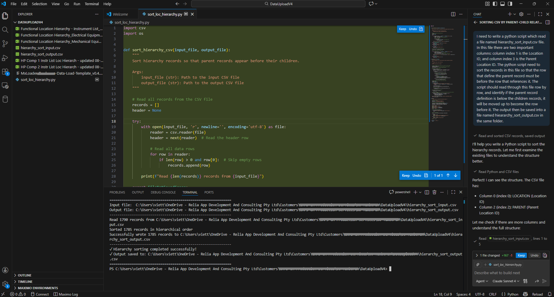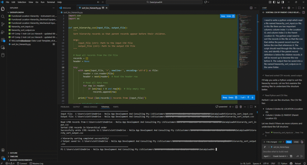 I described the data in my CSV file, explained what I wanted to achieve, and told it I needed a script to sort the data and save the output to a file, then pressed Enter. It analysed the input files, realised that what I described wasn’t 100% accurate, wrote the code, executed it, and then even read the output file to confirm the data was correct.
